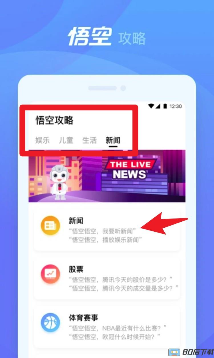 3. 前往「悟空攻略」版块,切换到「新闻」标签后,即可通过语音指令播放今日新闻、股市、体育赛事等资讯内容,边听边学。
