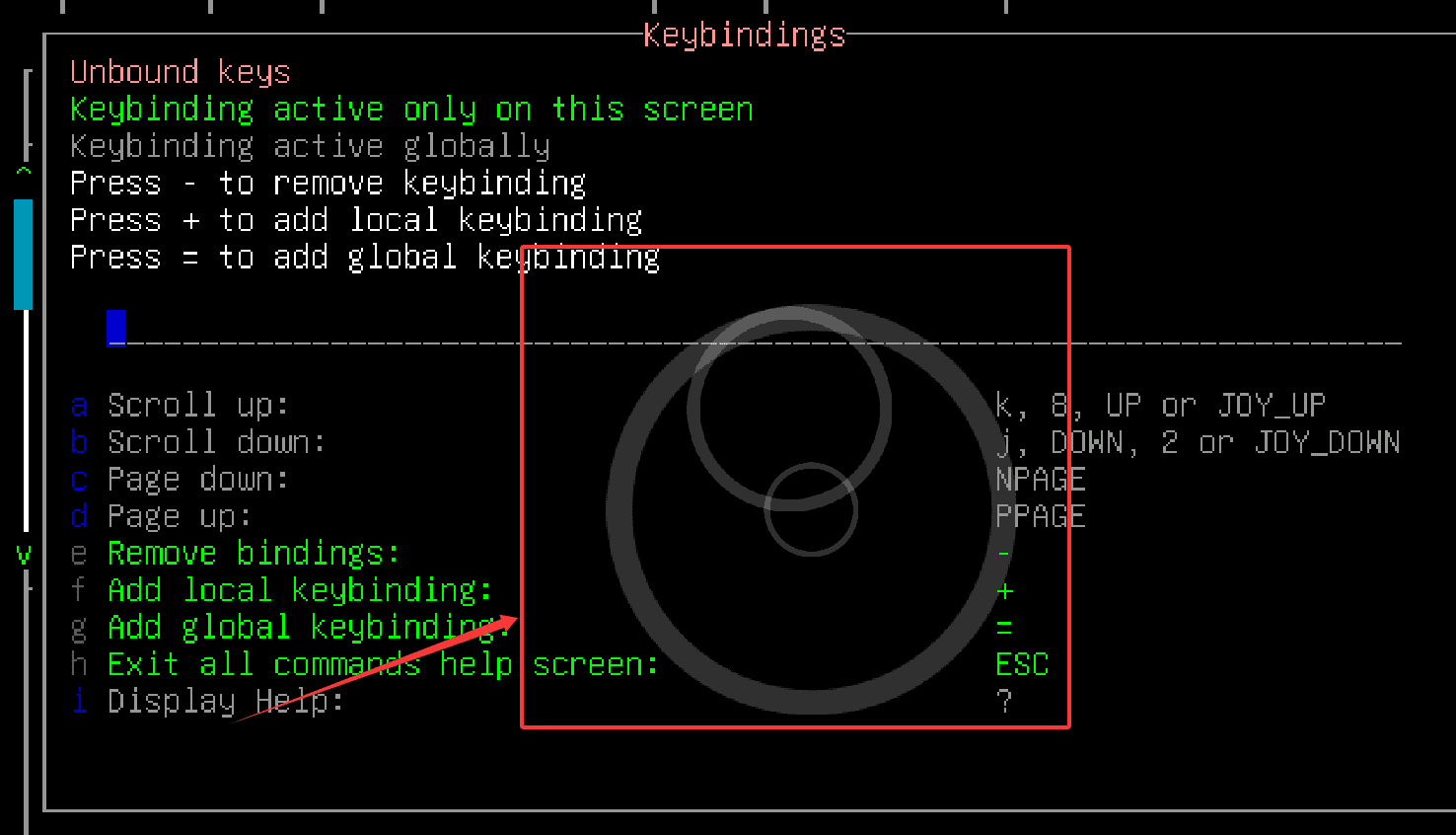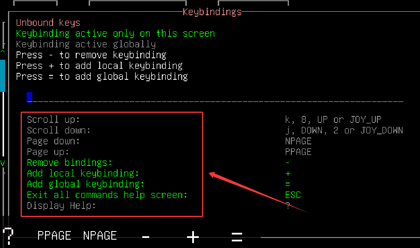 3、比方说,你想把“Scroll up”从默认的“k”改成其他键,就先用“-”清空,再用“+”或“=”重新绑定。
