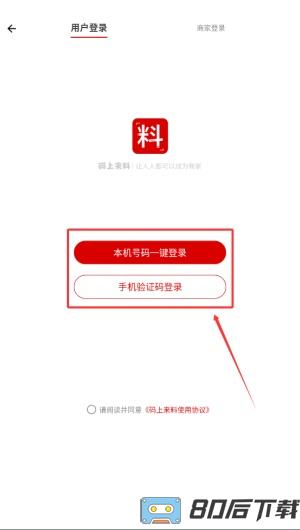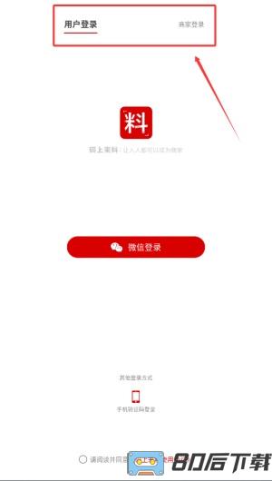 2、登录前需选择身份,可点击“用户登录”或“商家登录”进入对应通道。