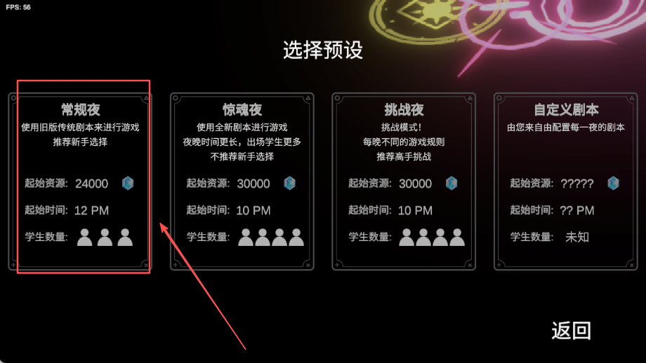 2、根据个人承受能力挑选常规夜晚模式作为入门选择,这个模式难度适中适合初次接触此类游戏的玩家逐步适应游戏基本玩法机制和恐怖氛围。