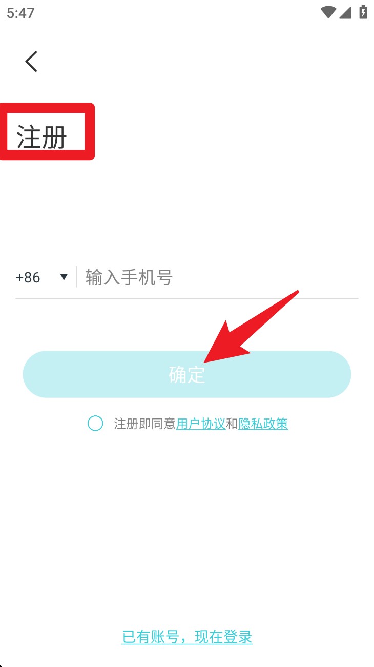 1. 打开 App 后点击“注册”,输入手机号码并勾选协议,点击“确定”即可完成账号注册。