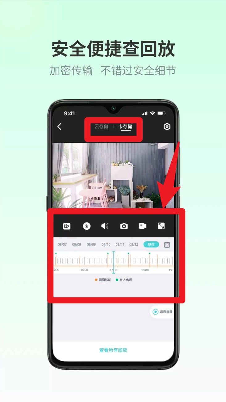 4. 若需回看历史影像,点击“回放”功能,支持查看云存储或卡存储的时间轴画面。
