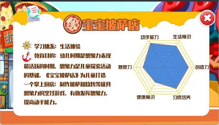 宝宝披萨店小游戏是一款为儿童打造的益智游戏,孩子可以在这款游戏上面进行披萨的制作,可以制作各种各样的披萨,非常的全面。有效的培养了孩子独立思考的能力以及动手能力,如果需要用的话欢迎前来下载哦。