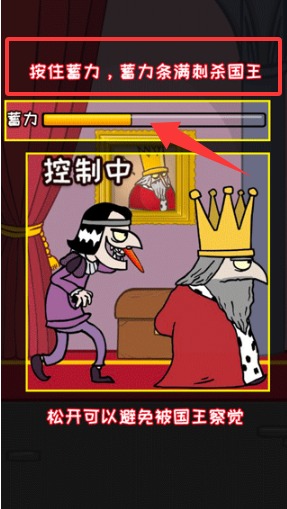 2、遇到国王时需要长按屏幕进行蓄力准备。松开手指就能实现隐蔽行动,避免被目标察觉。