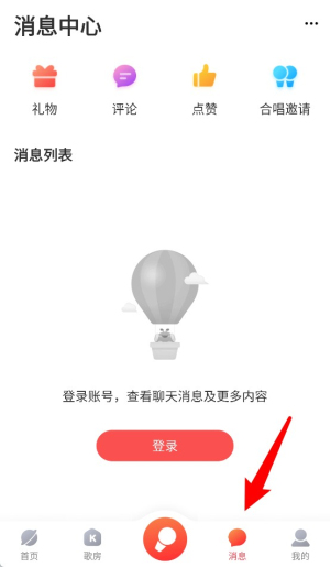 4、点击“消息”查看礼物、评论、点赞与合唱邀请等互动提醒。