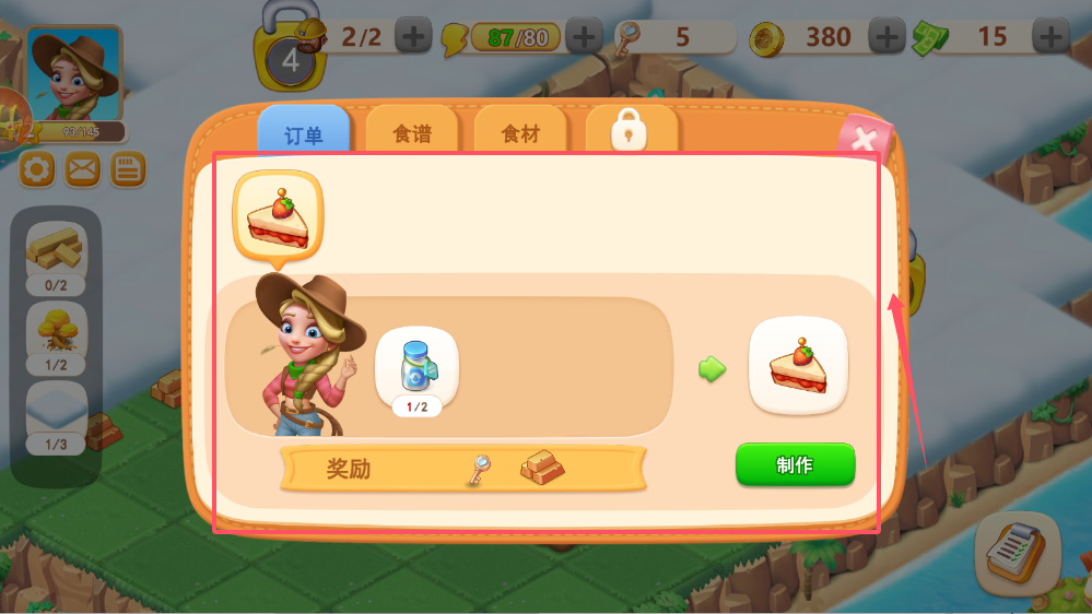 2、订单系统连接着生产与销售,牛仔角色给出的蛋糕订单需要5个罐子来完成。接受订单前要确保食材充足,制作过程中要关注剩余时间。