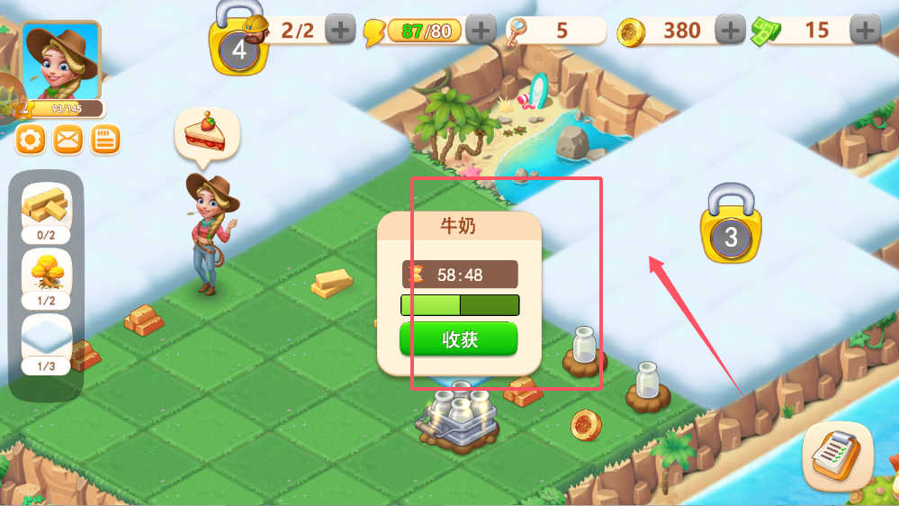 4、生产设施都有固定的运作周期,牛奶厂的倒计时显示剩余生产时间。你可以选择自然等待,也可以使用“消耗2移除”来立即完成。