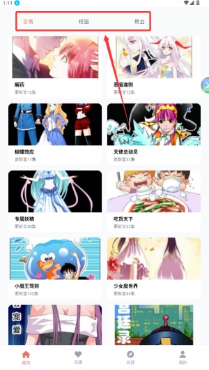 1、进入漫画专区后,您可根据偏好选择如冒险、恋爱等漫画题材类型。