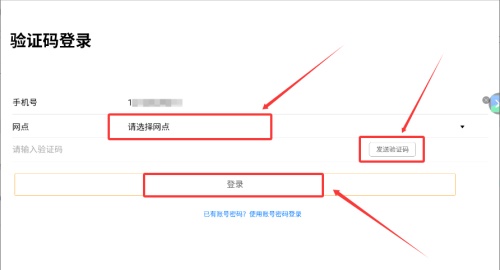4、接着从列表中选择您所在的网点信息,获取验证码并填写后点击登录。