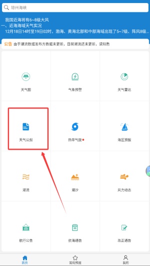 2、进入软件首页后,请在功能列表中点击“天气公报”栏目查看。