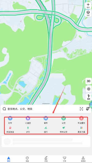 1. 点击底部「首页」进入主界面,可选择驾车、公交、打车、订酒店等出行方式。