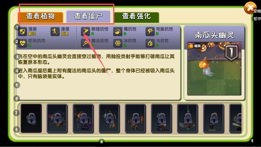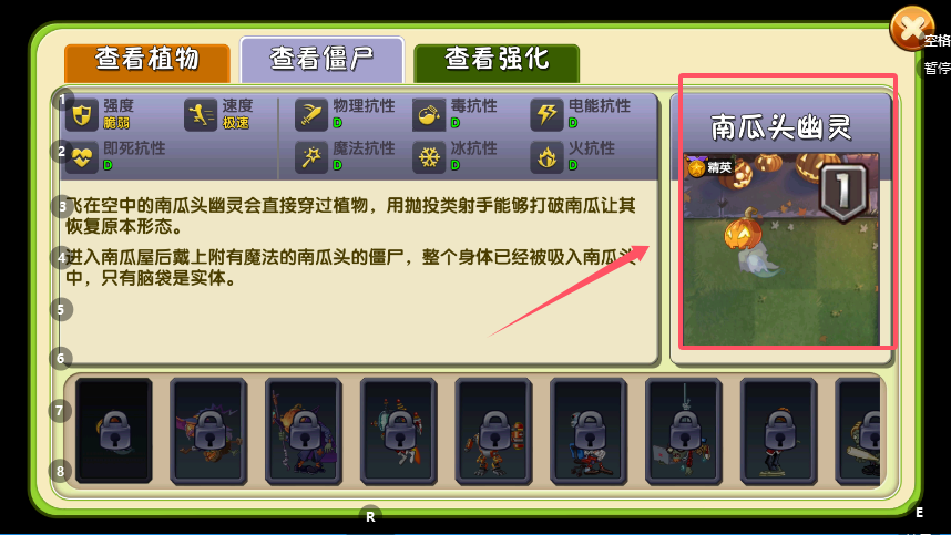 2、以查看僵尸为例,点击“查看僵尸”标签后,界面左侧列表会罗列已遭遇的僵尸种类。点击任意僵尸头像,其右侧便会展开详细面板,包含各项属性数值与特殊技能的文字描述。