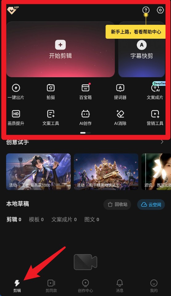 1、点击底部“剪辑”按钮,即可进入剪辑首页,支持一键出片、字幕快剪、AI消除等功能操作。