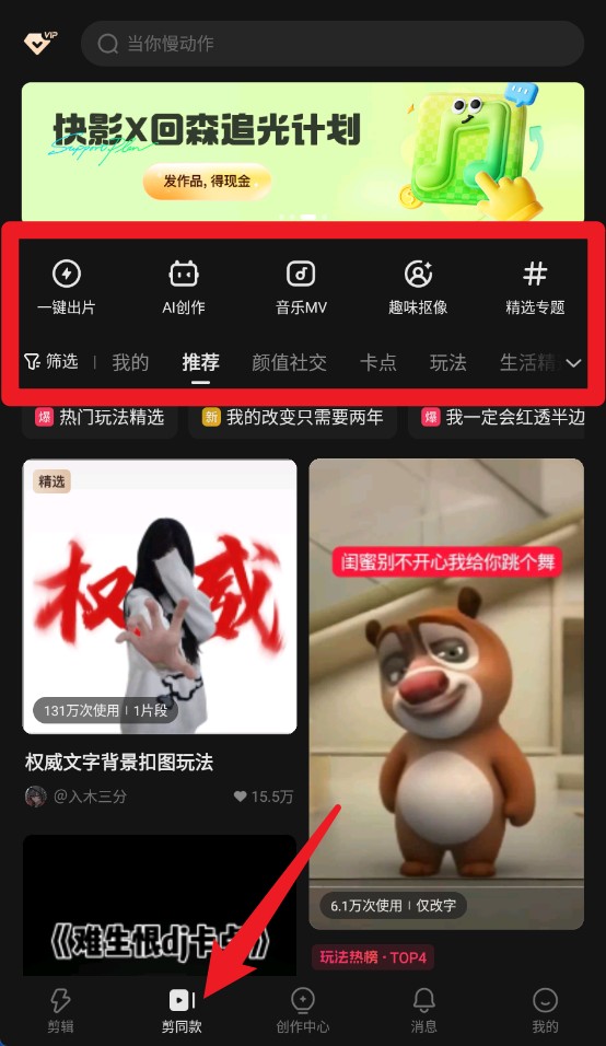 2、点击“剪同款”可浏览热门模板与玩法,涵盖音乐MV、趣味捏脸、精选专题等丰富内容。