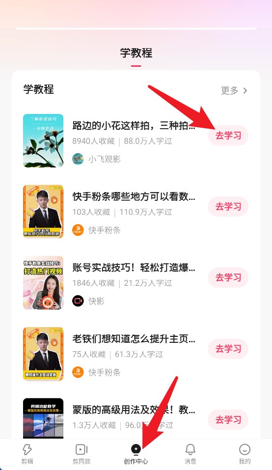 3、在“创作中心”中可以学习实用拍摄剪辑教程,助你快速掌握技巧,提高内容创作能力。