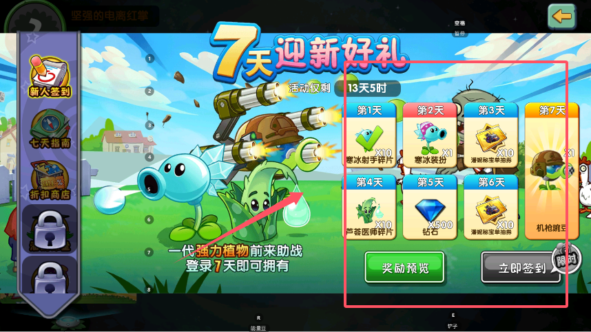 4、从活动开始日起,每日登录游戏并进入该页面点击签到,即可逐日解锁对应奖励。连续签到达到第7天时,便能获得“机枪豌豆”等稀有植物,这些植物在实战中能发挥重要作用。
