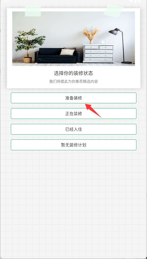 1、打开应用后,根据您的实际情况点击选择“准备装修”或“正在装修”等状态选项。