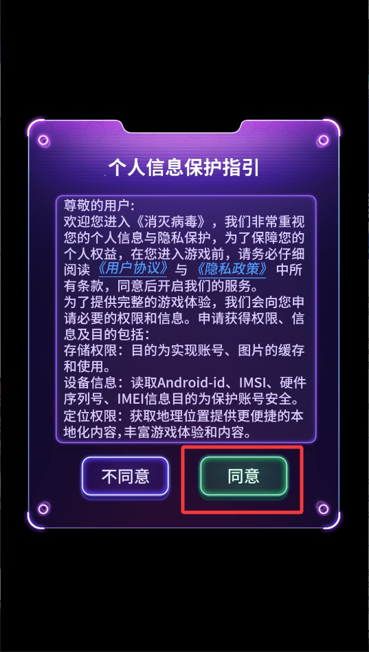 1、打开游戏后,首先会弹出用户协议页面,请点击同意按钮。这是进行后续步骤的前提条件,否则可能无法正常进入。