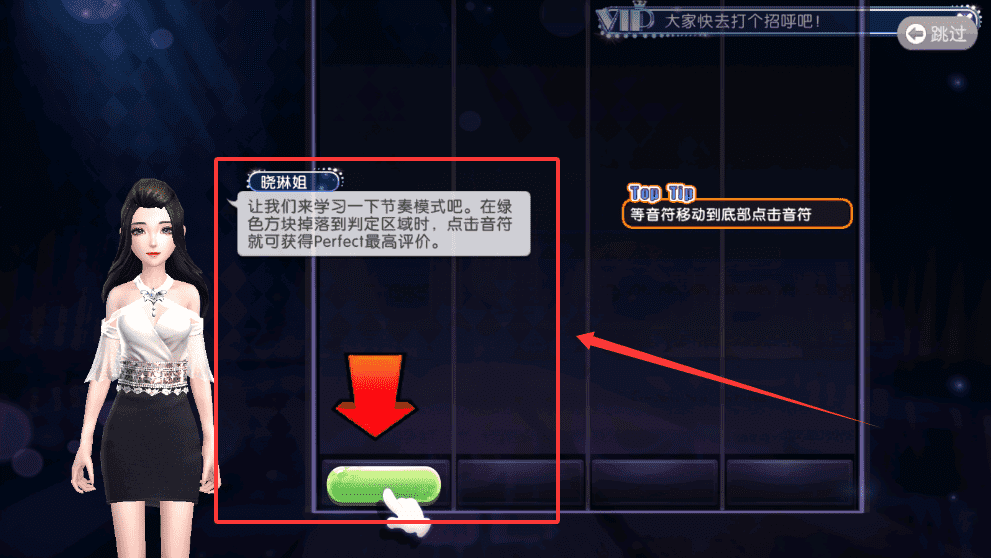 1、当它落到底部那个亮亮的判定区域时,轻轻点一下屏幕上的音符,就能拿到最棒的“perfect”评价哦。