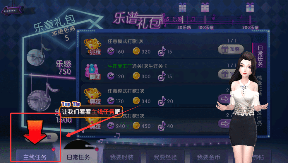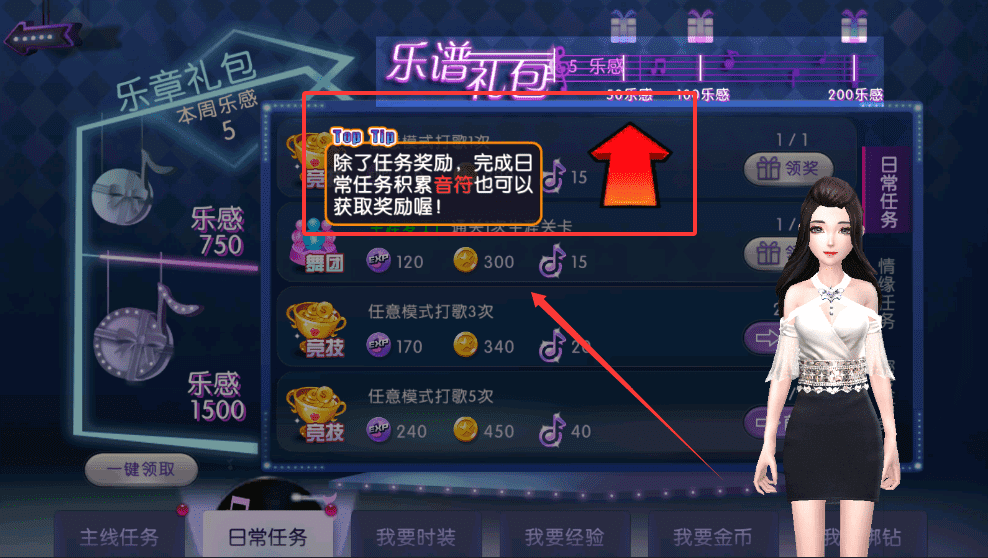 3、这些任务会定向奖励你需要的道具,跟着任务指引打歌5次或完成竞技目标,就能拿到较多经验与金币。