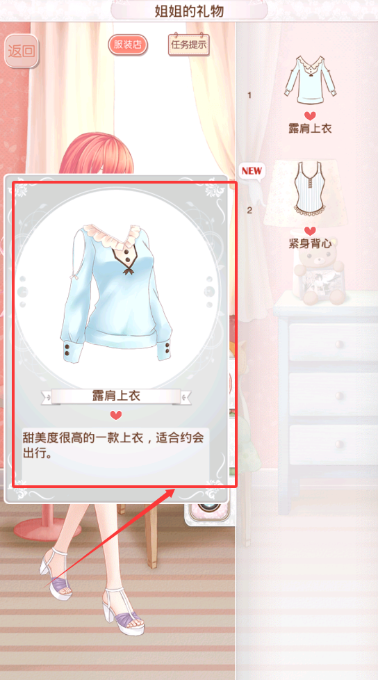 1、点击查看详细说明,比如甜美度、适合场合等,再根据任务提示来选择合适的服装进行搭配哦。