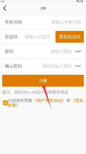 3、根据提示依次输入手机号码、短信验证码及个人设置的登录密码,完成注册流程。