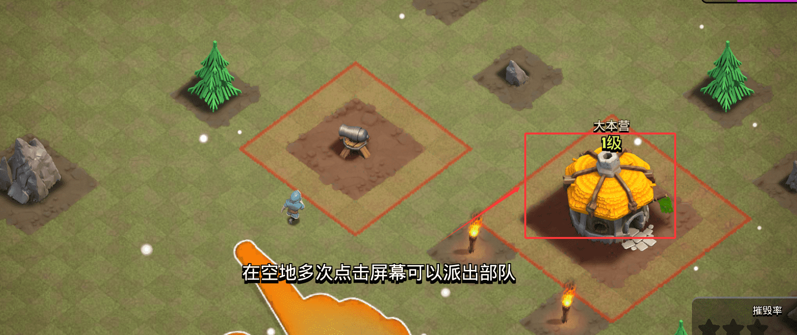 3、大本营是你最重要的核心建筑、需要重点保护。界面左下角显示着大本营当前等级和毁坏率。