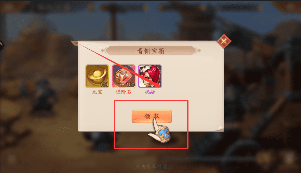 1、比如领取“青铜宝箱”,里面包含元宝、进阶石甚至“祝融”这类武将,这是初期获取资源的重要途径。