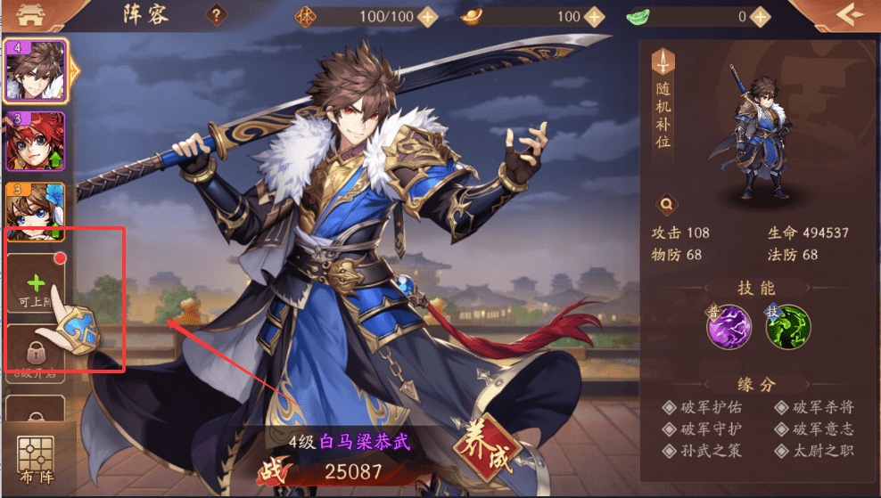 2、你可以将拥有的武将拖拽上阵,注意武将之间的“缘分”搭配,例如同时上阵特定武将能激活“破军护佑”等属性加成。