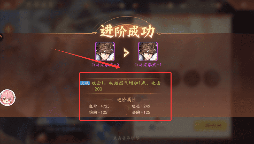2、优先使用“进阶石”和“银币”给主力武将“进阶”,比如白马梁恭。每次进阶不仅能提升生命、攻击等属性,还能解锁更强的“天赋”,比如增加初始怒气。