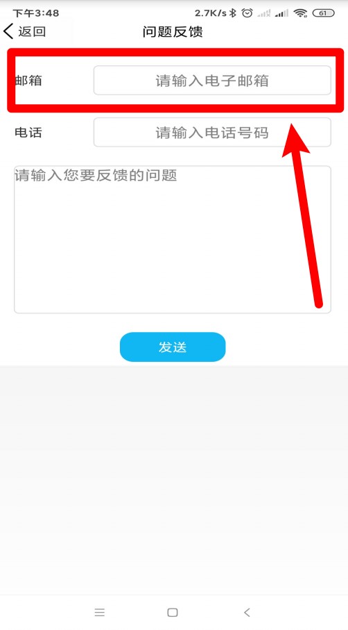 4.进入问题反馈页面后请在“邮箱”栏输入你的电子邮箱地址以便回复。