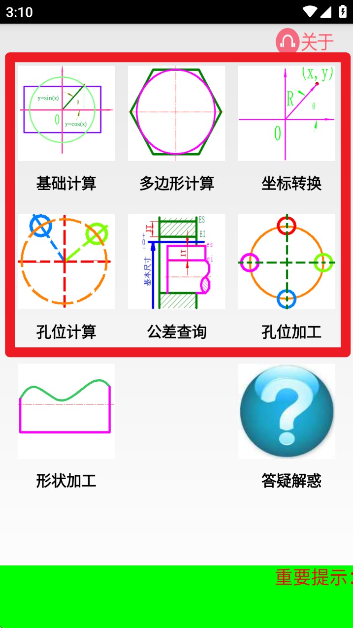 本软件是为加工中心或数控铣床操作人员开发的手机版编程工具,本工具可以快速生成操作者需要的程序,本软件功能有:基础计算、多边形计算、孔位计算、孔位加工、形状加工,能够快速帮助操作者解决加工中的难题,是数控操作者的好帮手。
