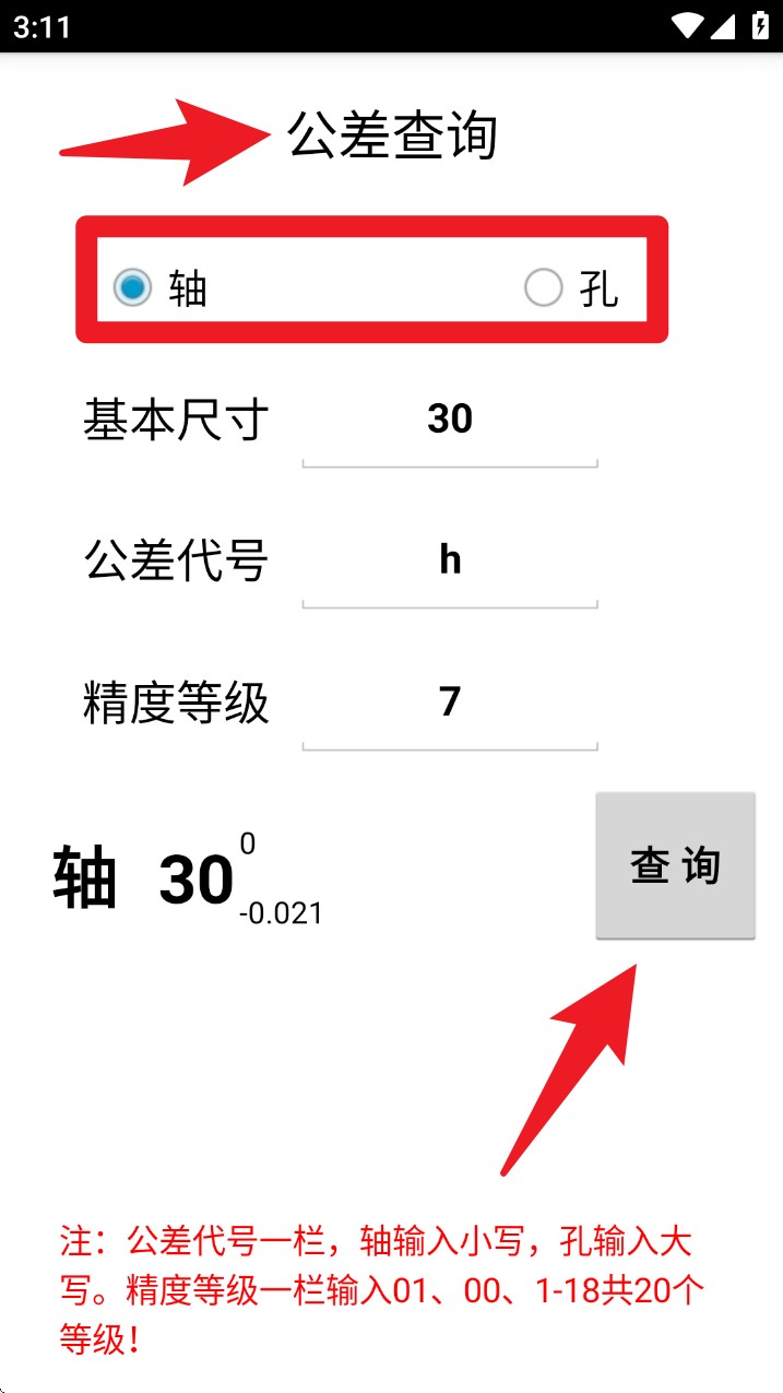 5. 进入「公差查询」功能页,选择轴或孔的类型,填入基本尺寸、公差代号与精度等级,点击右下角的查询按钮即可得出标准值。