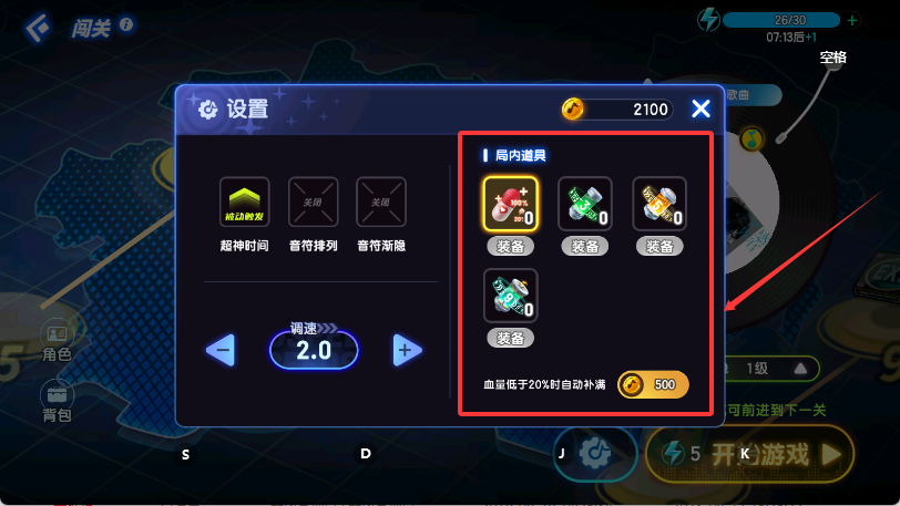 4、还可以开关“音符排列”等视觉特效,或者在“局内道具”栏装备道具。确认所有设置后,点击右下角的“开始游戏”,挑战就正式开始了。
