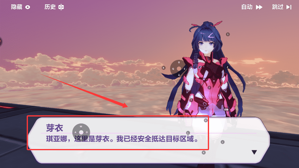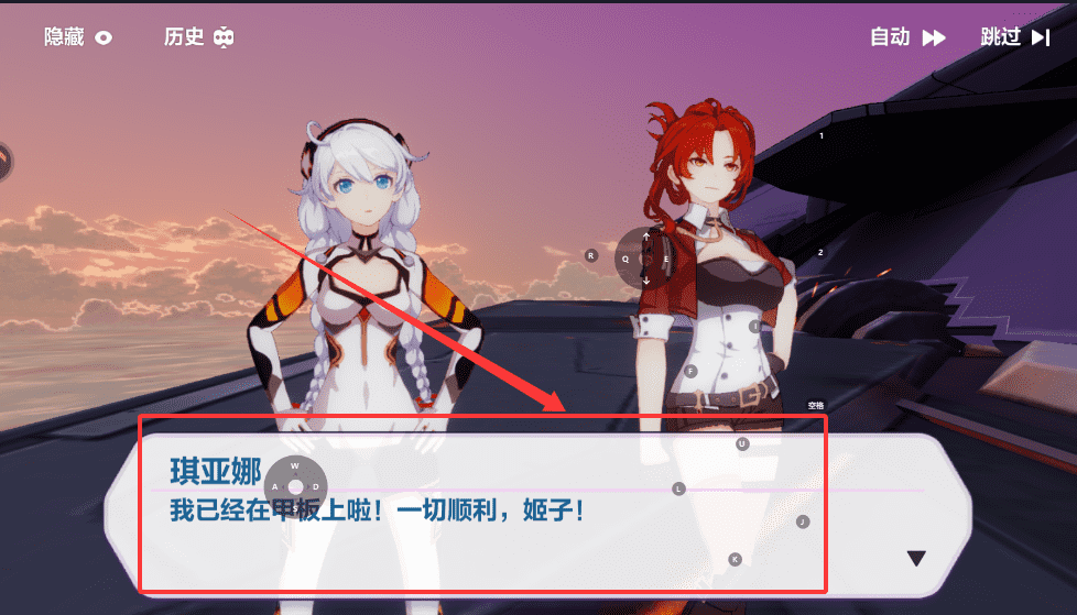 2、比如在剧情中遇到琪亚娜或芽衣的对话时,如果不想手动点击,可以开启自动播放,想快速推进则使用跳过功能。