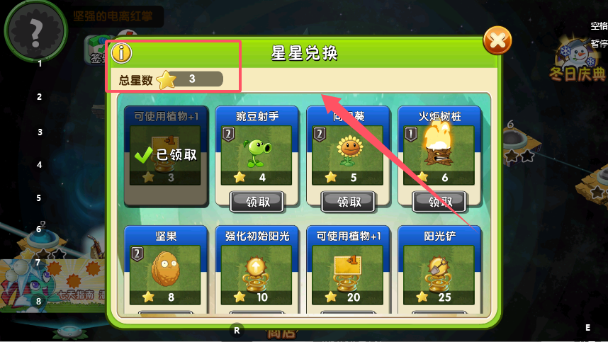 2、在星星兑换页面,查看总星数与各道具的星星消耗,比如“向日葵”需要5颗星星,星数达标的情况下,点击道具下方的“领取”按钮,即可获得对应的植物道具。
