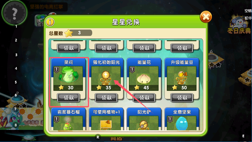 2、在星星兑换界面,查看总星数和每个道具的星星要求,例如“豌豆射手”需要4颗星星,当星数满足时,点击道具下方的“领取”键,就能拿到对应的植物或功能道具。