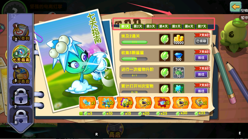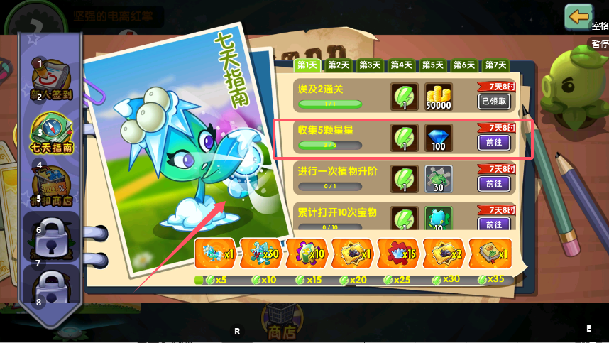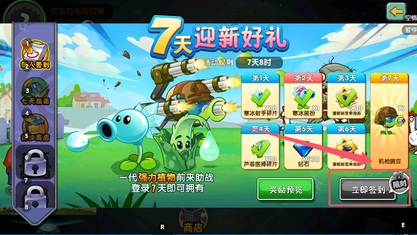 4、活动说明明确提示“一代强力植物前来助战登录7天即可拥有”,通过连续七日登录的简单操作,新玩家就能获得寒冰射手这款经典控场植物,有效提升前期关卡的通关效率。