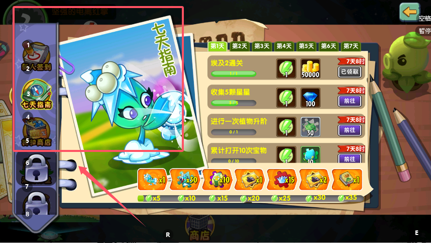 2、第二天转为收集模式需要获取五颗关卡星星,这个设计引导玩家关注关卡挑战目标,同时领取的三十钻石可用于超值商店首轮兑换,开始构建自己的特色植物阵容。
