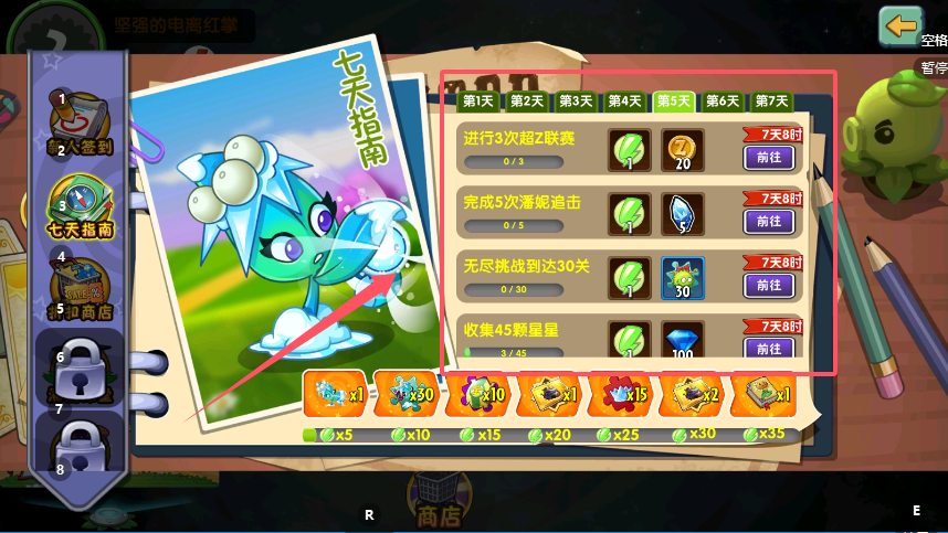 3、“七日签到”机制实现零成本资源获取,仅需每日登录便能领取寒冰射手碎片,集齐后合成的控场植物在游戏前期表现卓越,是提升阵容强度的最佳免费途径。