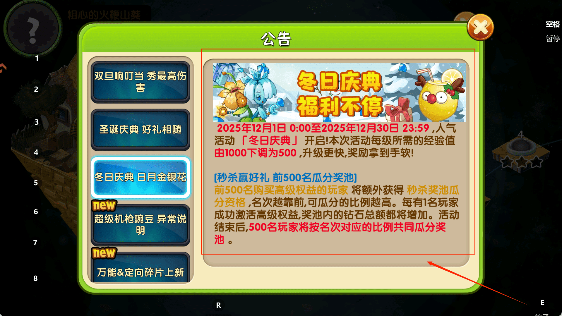 1、首先确保你的游戏已经更新到了3.9.2版本,然后到“公告”栏找到“圣诞回归季”的活动说明,里面会有关于新植物“鸭梨”的详细介绍和获取方法。