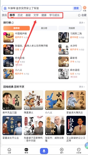3、在听书页面中请点击分类标签,选择您感兴趣的书籍类型。