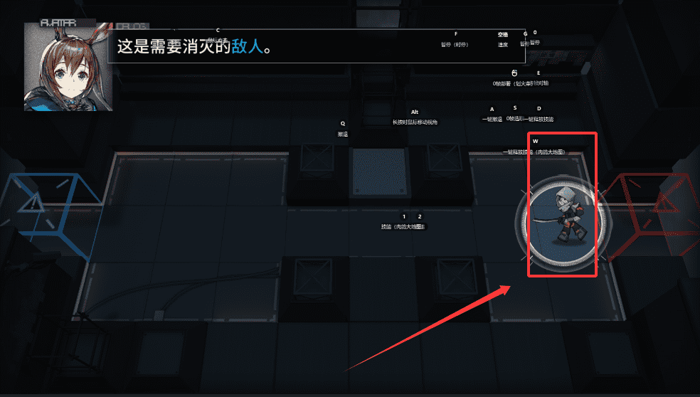 1、进入游戏先看敌人提示,使用w键释放技能攻击目标。