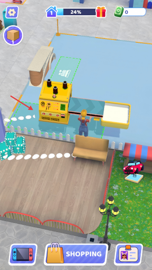 1、操控角色在场地中搬运散落的纸箱,将其集中收集,积累初始资源为后续店铺建设与布局调整奠定基础条件。