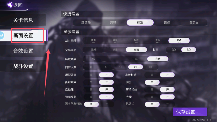 2、通过画面设置优化视觉表现,开启60帧模式保证战斗流畅度,选择高清画质提升细节呈现。合理的画面配置有助于更好地把握战场局势。