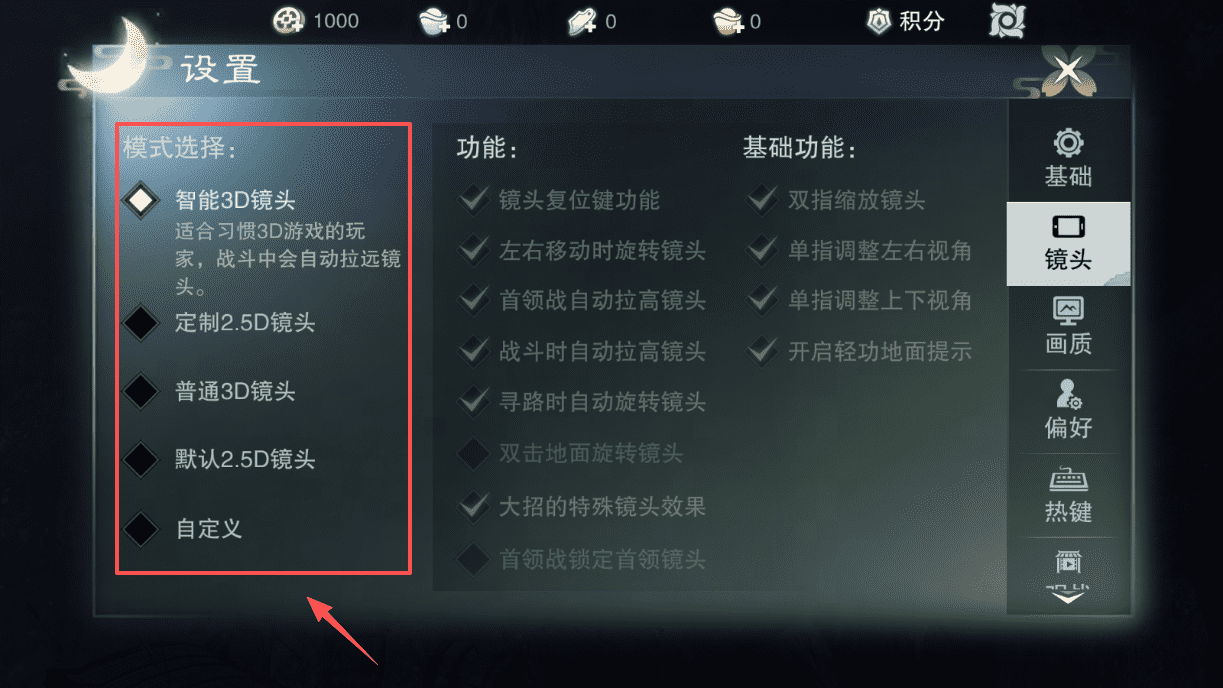1、进入设置调整镜头模式,智能3D适合习惯3D的玩家,还能开启双指缩放等功能哦。