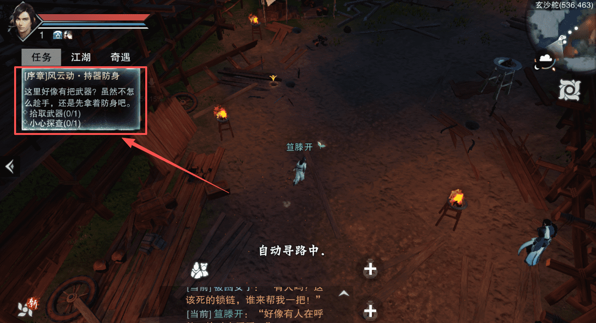 2、打开任务界面找到序章任务,像拾取武器,根据提示前往玄沙舵指定坐标。