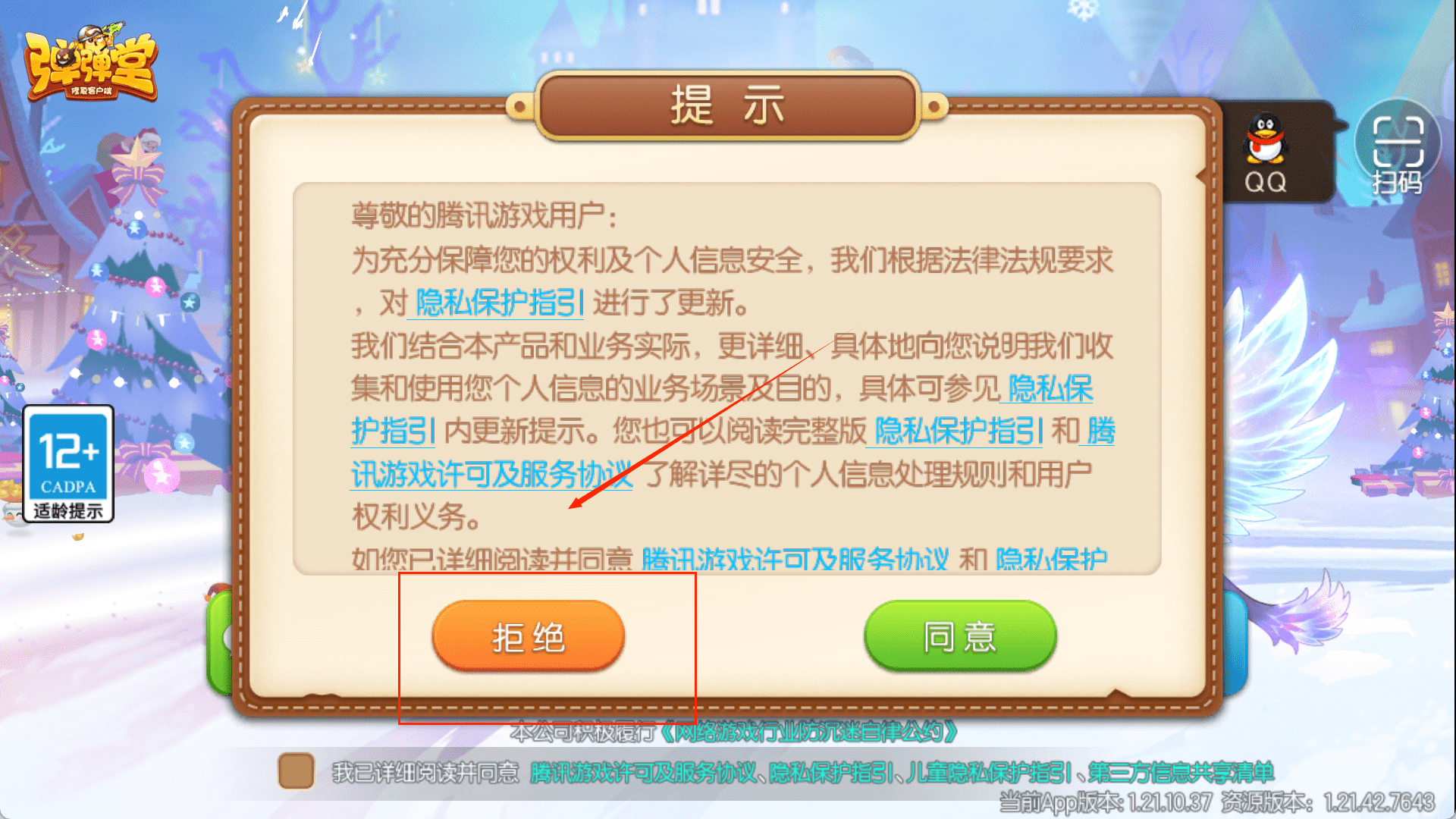 1、打开游戏后,首先会弹出隐私政策的更新提示,背景是梦幻的雪景。你需要下拉阅读完主要内容,然后在页面最下方找到那个小小的勾选框,点击一下表示同意相关协议。