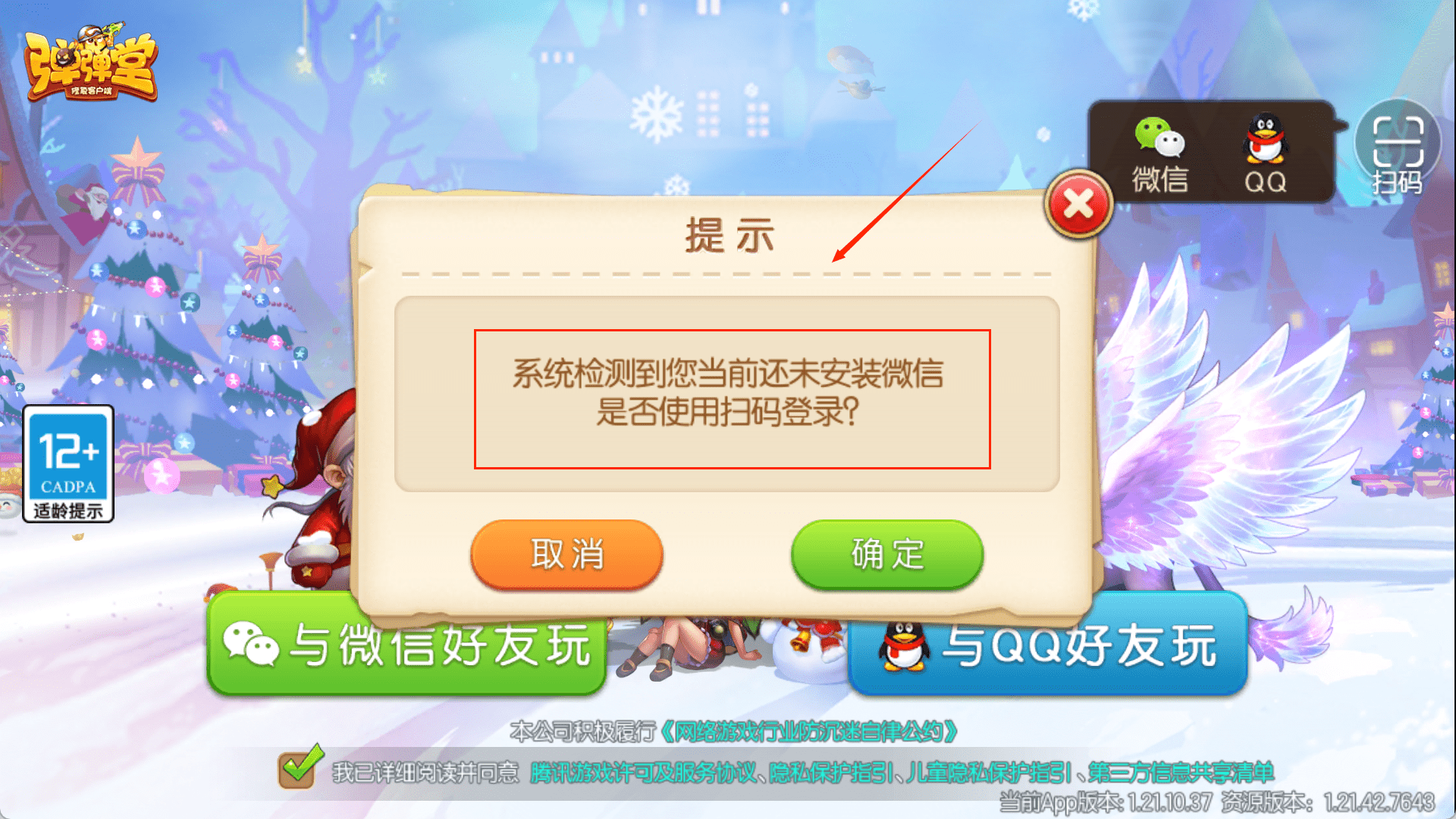 3、现在来到真正的登录界面啦,画面里有圣诞老人和神兽。首先注意界面上的“12+”标识,确认年龄符合。接着,点击底部你常用的社交软件按钮,比如绿色的微信图标,来登录游戏。