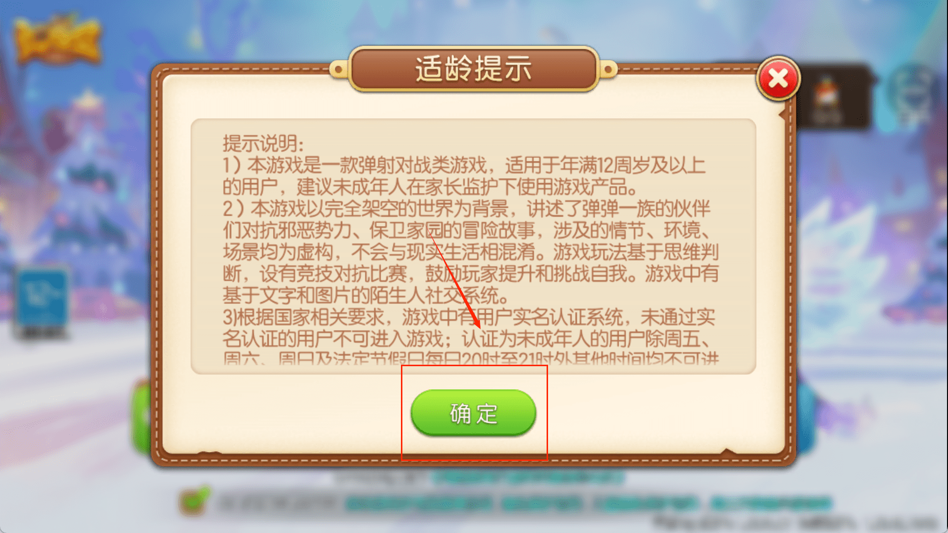 1、启动《弹弹堂手游》,首先会出现一个带“提示”字样的窗口,讲的是隐私指引更新。这个窗口背景很梦幻,有雪花飘落。你需要操作的是,在窗口底部点击绿色的“同意”按钮来确认。